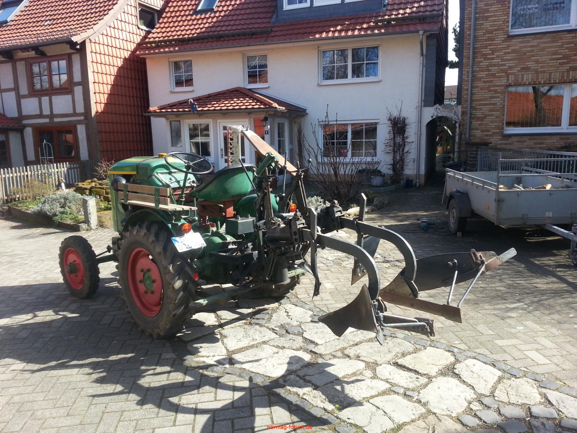 Der Pflug wird mittels eigener Hydraulik ( über Zapfwelle angetrieben ) ausgehoben. Er war original an einem 22 PS Fahr verbaut.