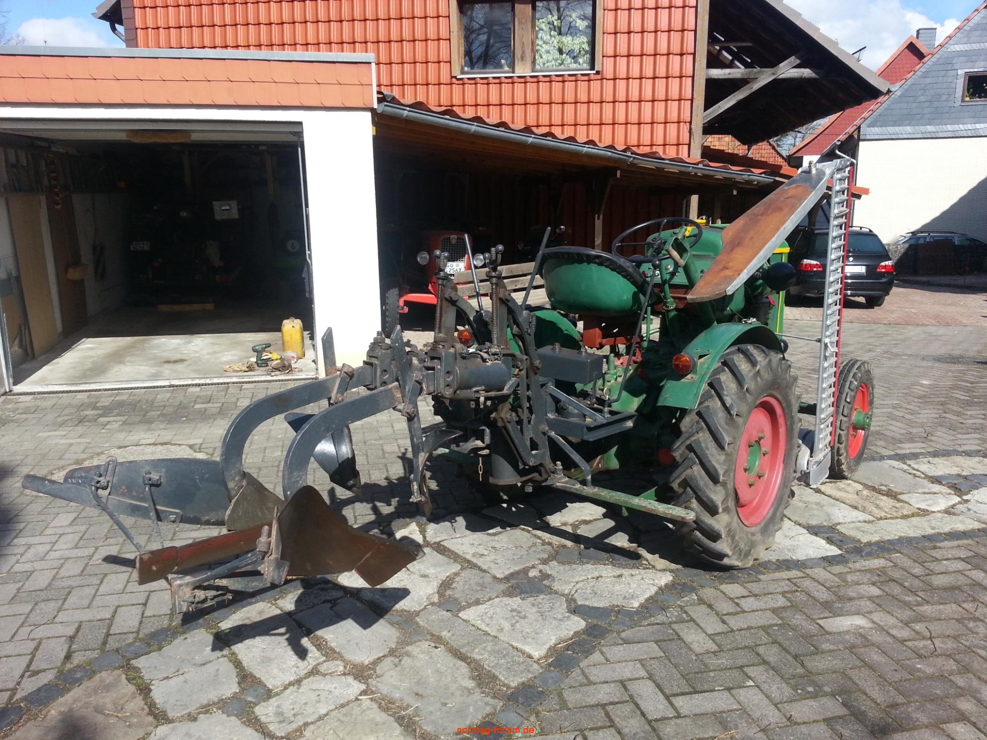 Der Pflug wird mittels eigener Hydraulik ( über Zapfwelle angetrieben ) ausgehoben. Er war original an einem 22 PS Fahr verbaut.