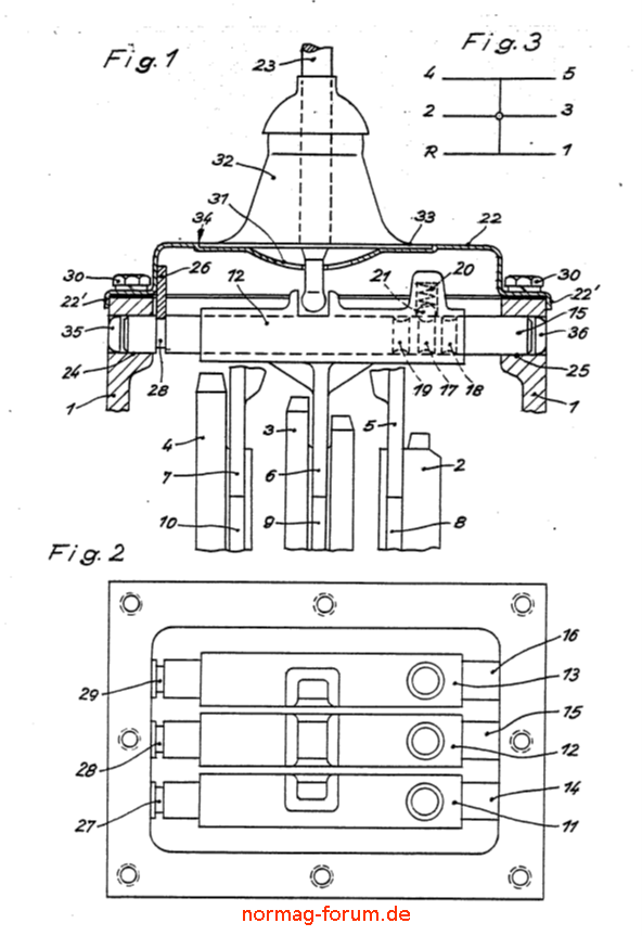 Bildbeschreibung: Schemaplan des 5+R Normag Getriebes, kopiert aus der Patentschrift (PDF) die ich hier nicht hochladen kann....