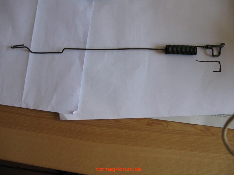 Bildbeschreibung: So sieht die Zugfeder der Handbremse am K12a aus, wobei das rechte Ende der abgebildeten Feder "repariert" wurde, wahrscheinlich war es abgerissen. Original muss es so aussehen, wie es die Zeichnung darunter zeigt. Durch die Ausbuchtung kurz vor dem linken Ende der Feder umgeht diese die Kardanwelle.