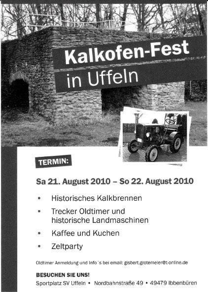 Hallo Zusammen, hätte fast vergessen auf eine interessante Veranstaltung bei uns in 49479 Ibbenbüren-Uffeln hinzuweisen, s. Flyer als Anlage. Am kommenden WE 21/22. August findet bei uns ein "Kalkofenfest" statt. Zentrales Thema ist Kalkbrennen nach historischem Vorbild in einem renivierten Kalkofen. Um das Rahmenprogramm etwas aufzuwerten haben wir uns entschlossen am Sonntag ab ca. 11.00 Uhr auch eine Ausstellung von Trecker-Oldtimern und historischen Landmaschinen anzubieten. So ist z.B. Kramerpower mit seinem schönen NG22 da. Ich werde meinen F12b ausstellen und ein K12 wird aus dem Nachbarort auch wohl da sein. Wir lassen uns überraschen was sonst noch kommt. Es ist eine kleine, übersichtliche Veranstaltung aber wer kurzfristig Lust und Laune hat ist natürlich herzlich eingeladen, mit oder ohne Trecker!
