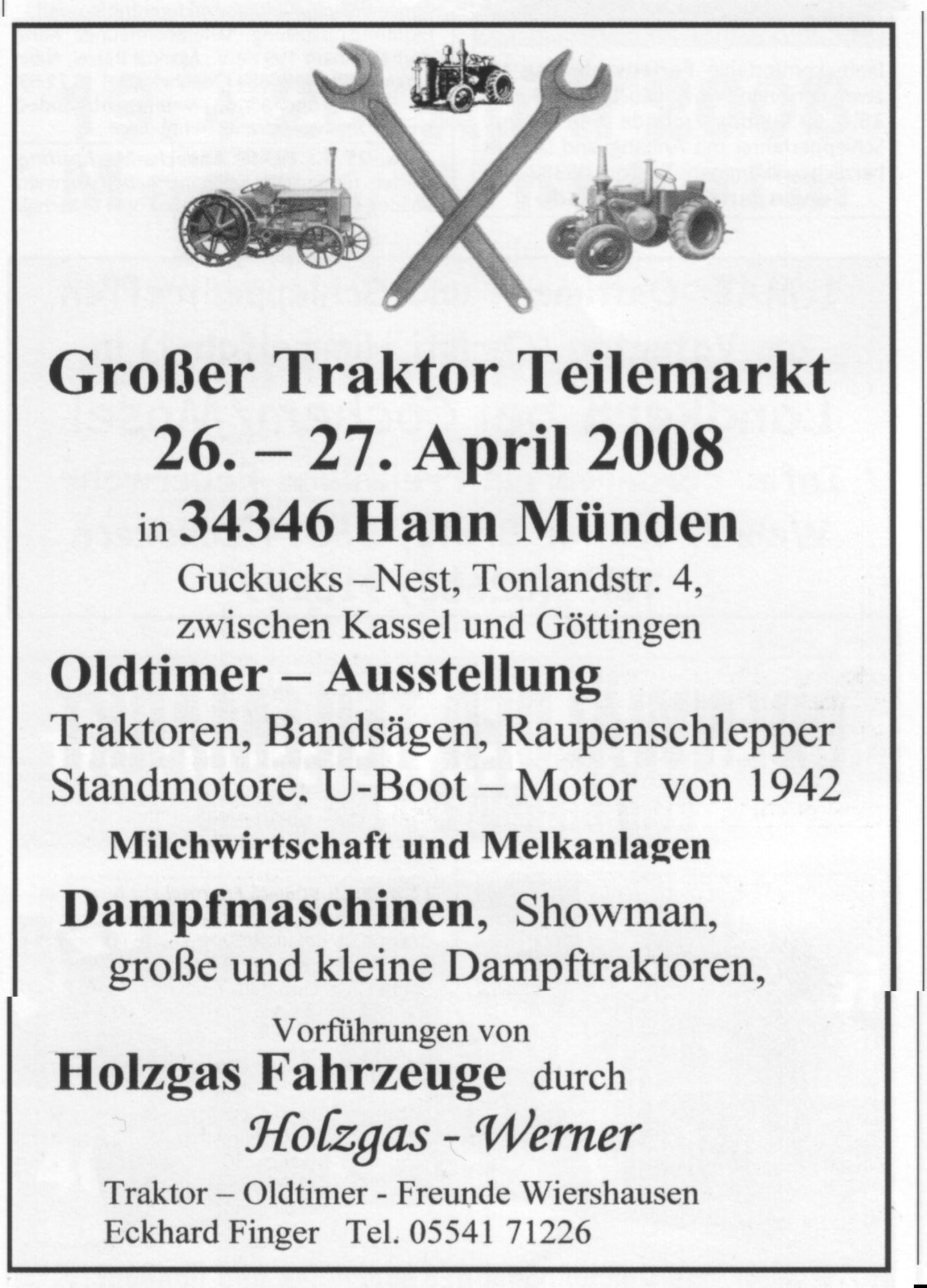 Großer Traktor Teilemarkt und Oldtimerausstellung am 26. + 27. April 2008