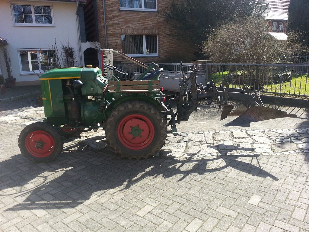 gleich zu Anfang, ich bin der Farbe Grün treugeblieben. Ein ehemaliger Arbeitskollege der seit 10 Jahren in Rente war, ist Ende Januar plötzlich verstorben. Einige Forenmitglieder kannten Waldemar. Ich bin fast jede Woche einmal bei ihm gewesen und habe ihm bei vielfälltigen Arbeiten an seinen Oldtimern (32 Stück) helfend unter die Arme gegriffen. Waldemar war hauptsächlich Lanzspezi aber auch andere Marken (u.a. 1x Ursus, 7x Deutz, 1x MAN, 4x Hannomag, 1x Güldner, 1x Ferguson, 1x Hela Variomot, 3x Unimog, 1x Fendt, 1x Fahr und 1x Normag NG 22 BJ. 1938) gehörten zu seiner Sammlung. Ein umfangreiches Ersatzteillager wr auch vorhanden. Diese Sammlung wurde/wird nun nach und nach veräußert. Ich bin von der Ehefrau und den "Kindern" gebeten worden dabei mit Rat und Tat Unterstützung zu leisten. Das meiste ist Gott sei Dank schon verkauft. Bevor Fragen aufkommen, der NG22 ist noch da, (wunderschön patiniert, Einzelsitz und mit richtig altem selbst gebauten Verdeck) ich konnte aber noch keine vernünftige Fotos machen da er zwischen anderen Fahrzeugen in der Garage steht.