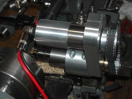 Dieses Gerät wird an der Zahnradschere der Myford befestigt und greift mit dem Zahn in ein bestimmtes Zahnrad ein. Durch dieses "festsetzen" wird die Haupspindel an einer bestimmten Position gehalten und damit ist dieses Helferlein eine Teileinrichtung.