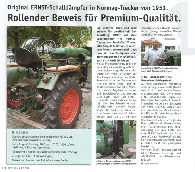 Hallo Normagfreunde, habe mal im Frühsommer 2007 im Internet gestöbert und den Hersteller des Auspuffs an meinem NG15 gesucht. Gibt es die Firma noch oder bis wann hat es Sie gegeben. So rein Interesse halber. Und tatsächlich, die Firma gab es noch.  Sie ist eine der führenden Hersteller in der Abgastechnologie. Ich habe mich dann auf einem Kontaktformular für die gute Qualität bedankt, denn der Auspuff war ja mittlerweile 56 Jahre alt und noch nicht durchgerostet.  Die Firma Ernst aus Hagen, direkt an der A1 gelegen, hat tatsächlich zurückgeschrieben. Sie baten mich einen Außendienstmitarbeiter vorbeischicken zu dürfen. Dieser kam Ende August zu mir, hat einige Fragen über die Lebensgeschichte und Daten des Treckers gestellt und Fotos gemacht. Es sollte ein Bericht in die Firmenzeitung kommen. Dieses ist dann auch Mitte November geschehen.(siehe Artikel unten) Ich bekam einen großen Briefumschlag von der Firma Ernst der für einen neuen Auspuff leider zu klein war.  War auf den Inhalt aber dennoch sehr gespannt. Es befand sich darin eine Uhr mit Firmenlogo, ein Metallmodell eines Sattelschleppers mit Firmenlogo auf der Plane, ein Mont Blanc Kugelschreiber, logischerweise auch mit Firmenlogo, eine Mitteilung in Form eines Dankschreibens und mehrere Exemplare der Firmenzeitschrift Reflexion mit dem Artikel über den Auspuff. Ich wollte dann die zuständige Sachbearbeiterin anrufen und mich bedanken und wegen dem Preis für einen neuen Auspuff nachfragen. Leider war Sie im Urlaub. Der Dank ist aber mittlerweile telefonisch raus, leider habe ich aber bis heute noch keine Antwort wegen dem Preis. (wahrscheinlich Kollege Dienstweg)  Ich bleibe aber am Ball. Sollte ich keine Preisauskunft bekommen war es trotzdem eine echt nette Geste von der Firma.  Man(n) soll die Hoffnung nie aufgeben. Vielleicht kann ich denen ja doch mal einen neuen Auspuff aus dem Kreuz leiern falls es den alten irgendwann zerlegt. Spätestens 2016 wenn der Auspuff mit 65 Jahren ins Rentenalter kommt und noch intakt ist, kann ich ja noch mal nachfragen!  Schau' n wir mal was draus wird. Dateianhang: