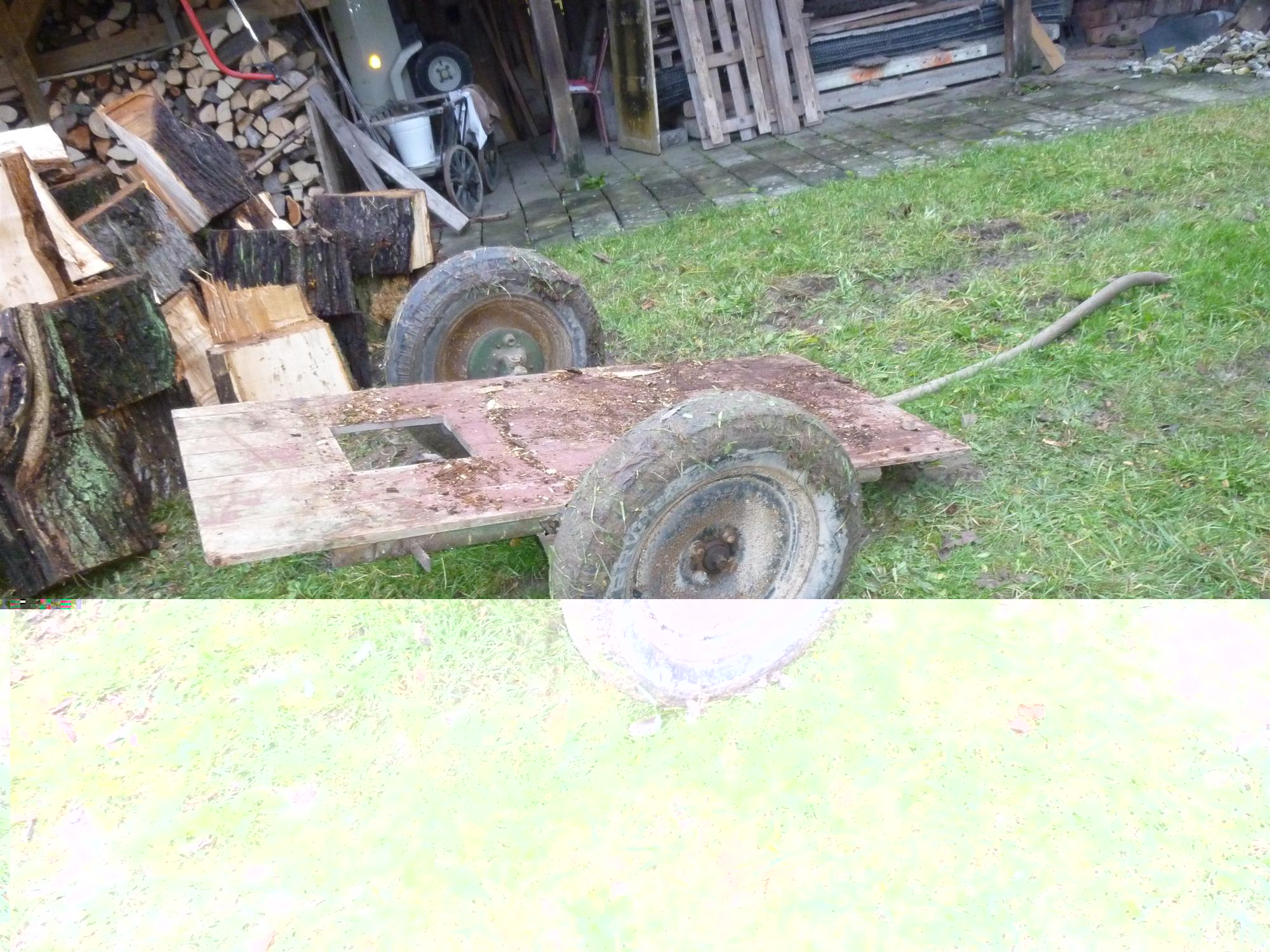 So am Samstag haben wir mal nur Holz gefahren So wie es aussieht gibt es erst im neuen Jahr wieder Fortschritte zu berichten. Leider habe ich früher keine Zeit mehr Anbei noch ein Bild vom ''Holzhänger'' mit Tür. Dies ist ein Eigebau mit alter Opel Vorderachse. Opa transportierte damit das Schlachtschwein Jedenfalls wird das unser Holzlader da er einen niedrige Ladepritsche hat. Davon werde ich auch wenn es soweit ist ein Bericht einstellen.