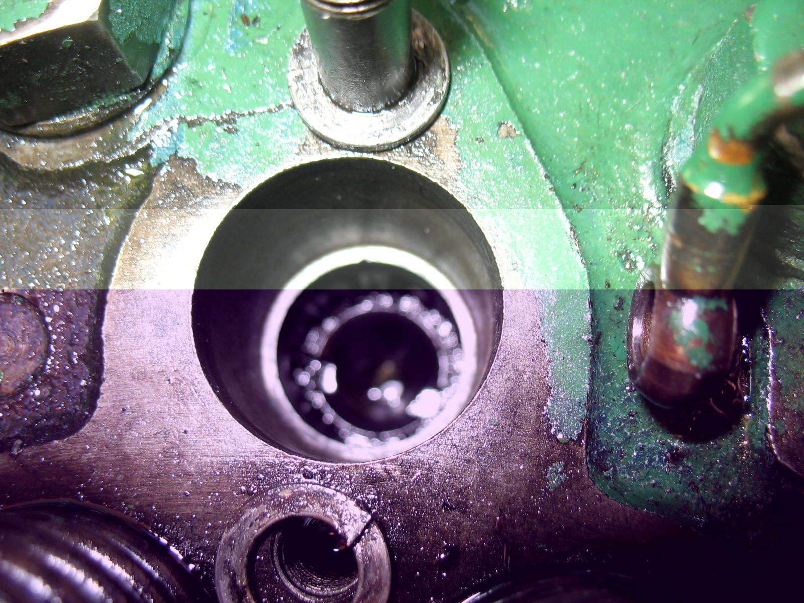 Hänge noch ein Bild von der ausgebauten Düsenhlterbohrung an, es ragen zwei Plättchen in die Bohrung hinein die ich nicht ganz zuordnen kann, etwas unscharf auf dem Foto.