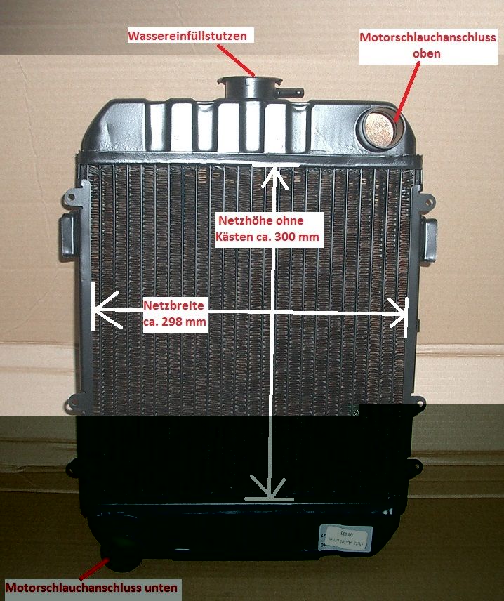 Der Kühler von meinem NG 16 ist undicht. Irgendwo im unteren Bereich des Netzes tröpfelt es. Ist zwar nicht viel. In 24 Stunden vielleicht eine halbe Kaffeetasse, aber trotzdem undicht. Hab schon versucht es von außen abzudichten. Leider ohne Erfolg. Ich scheue mich noch eine flüssiges Kühlerdichtmittel anzuwenden, das mir u. U. etwas zusetzt, was offenbleiben muss. Einen neuen Kühler zu bekommen ist so gut wie aussichtslos und eine professionelle Kühlerreparatur ist nicht gerade billig. Da ist mir der Gedanke gekommen im Netz nach einem gängigen Alternativkühler zu suchen, der von den Abmessungen einigermaßen passt. Fündig geworden bin ich beim Kühler für den Opel Kadett B/C (gebraucht ca. 60€, neu ca. 100 € + Versand). Er ist ca. 30 cm breit und von Ober- bis Unterkante der Wasserkästen ca. 41 cm hoch. (Original Normag 30,05 breit und 53 cm hoch). Passt also ungefähr. Lediglich die Kühlwasseranschlüsse sind unterschiedlich im Durchmesser (Opel 35mm, Normag 28mm) und Anordnung. Beim Opel ist der untere Anschluss zur WaPu links, bei Normag rechts. Aber dieses Problem ließ sich mit entsprechenden Formschläuchen und/oder Kupferfittings lösen. Auch die Befestigung wäre machbar. Hat da jemand Erfahrungen oder vielleicht auch Alternativvorschläge?